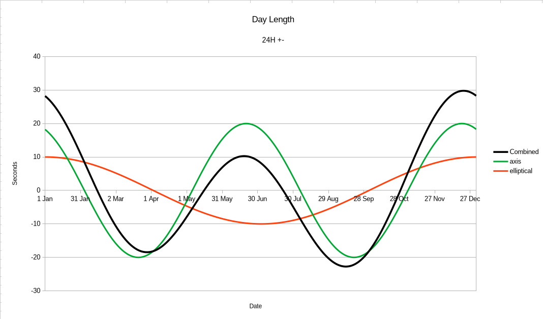 The length of a solar day, the time between two successive solar noons varies from 24h 30s around 23 December to 23h 59m 39s around 17 September.